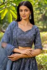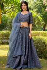Featuring a grey lehenga in georgette base with thread, mirror, and tassels embroidery. It is paired with a blouse and an organza dupatta. Accentuate with chandbali earrings and heels for a wedding or sangeet ceremony.