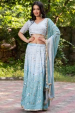 Featuring an ocean blue kalidar lehenga in georgette base with embellishments. It is paired with a blouse having a v-neckline and lace detailing, including a dupatta. Accentuate with chandbali earrings and heels for a wedding or sangeet ceremony.