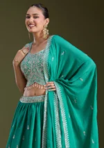 Readymade Lehenga in Soft Raw Silk fabric. The Lehenga is embellished with Zariwork (Silver) embroidery. Accompanied with an Readymade blouse and dupatta. Comes with the Koskii promise of premium quality.
