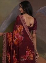 Embrace the epitome of ethnic opulence with this stunning Digital Print Gota With Sequins Faux Georgette Maroon Saree. Crafted to captivate this saree exudes elegance and charm perfect for special occasions or festive celebrations. The mesmerizing maroon hue of the faux georgette fabric sets the stage for a regal presence while the intricate digital print gota with sequins adds a touch of traditional glamour. Each gota with sequins detail reflects the light creating a dazzling effect that is sure to turn heads wherever you go. Designed with meticulous attention to detail this saree offers versatility and style. The lightweight fabric drapes gracefully ensuring comfort without compromising on sophistication. Whether youre attending a wedding a cultural event or simply indulging in your love for exquisite attire this saree is sure to make a statement. The blouse accompanying the saree offers an opportunity for customization allowing you to tailor it to your preferences and ensure a perfect fit. Whether you opt for a classic design or wish to incorporate modern elements the blouse serves as the perfect complement to the saree completing the ensemble with finesse. Elevate your wardrobe with this Ethnic Opulence Digital Print Gota With Sequins Faux Georgette Maroon Saree and make every occasion an unforgettable affair. With its timeless appeal and undeniable allure this saree is a testament to the beauty of traditional craftsmanship and contemporary elegance. Flaunt your style with confidence and grace leaving a lasting impression wherever you go.