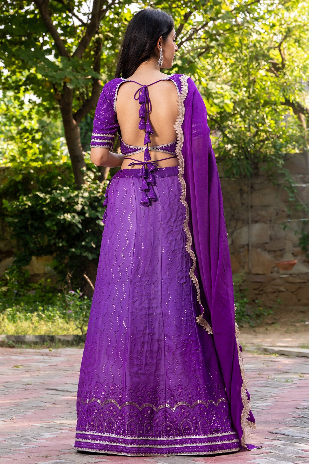 Featuring a violet lehenga in georgette base with embroidery and lace detailing on the hem. It is paired with a sequin-embroidered blouse and an organza dupatta. Accentuate it with dangler earrings and heels for a wedding or festive occasion.